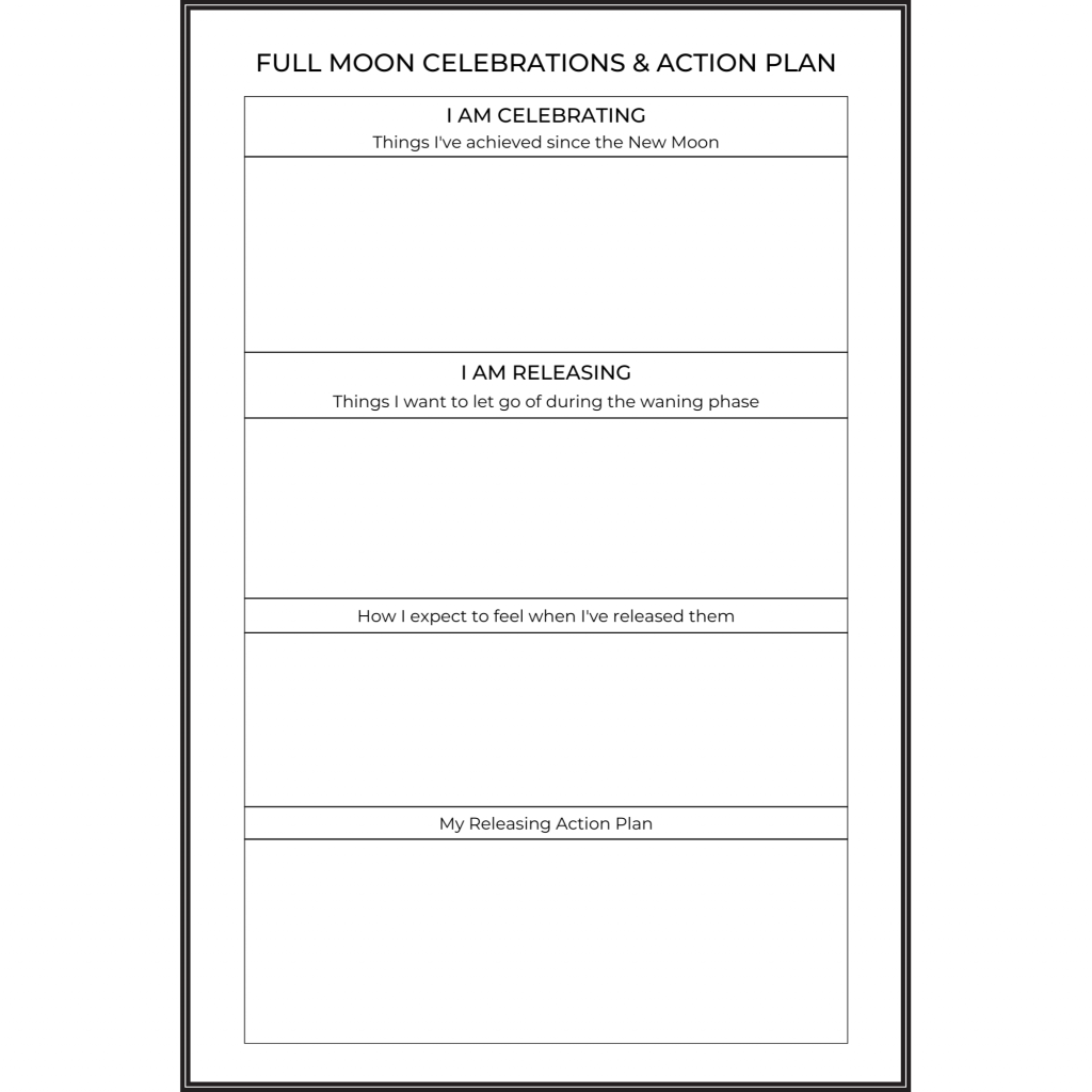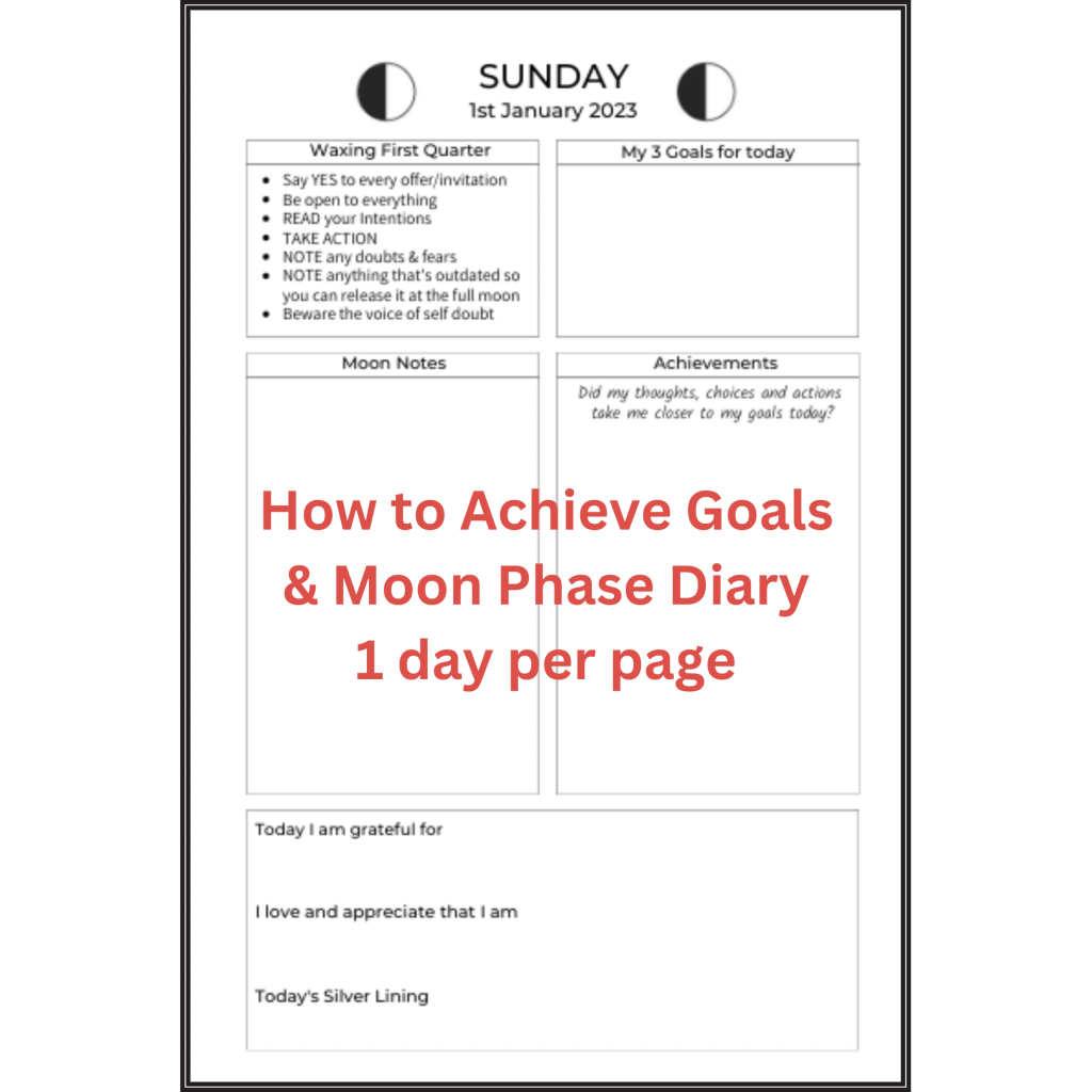 Step-by-step New Moon Worksheets that will help you to identify, set, track and achieve your goals; and Full Moon Worksheets to identify and release what’s been holding you back.